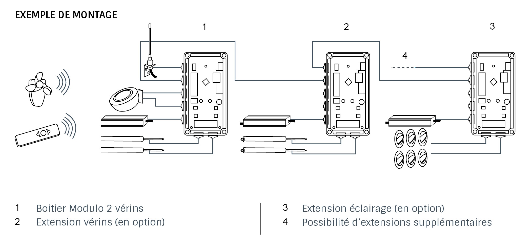 De plus, des boîtiers d’extension pour actionneurs et/ou éclairage peuvent être ajoutés selon la pergola.