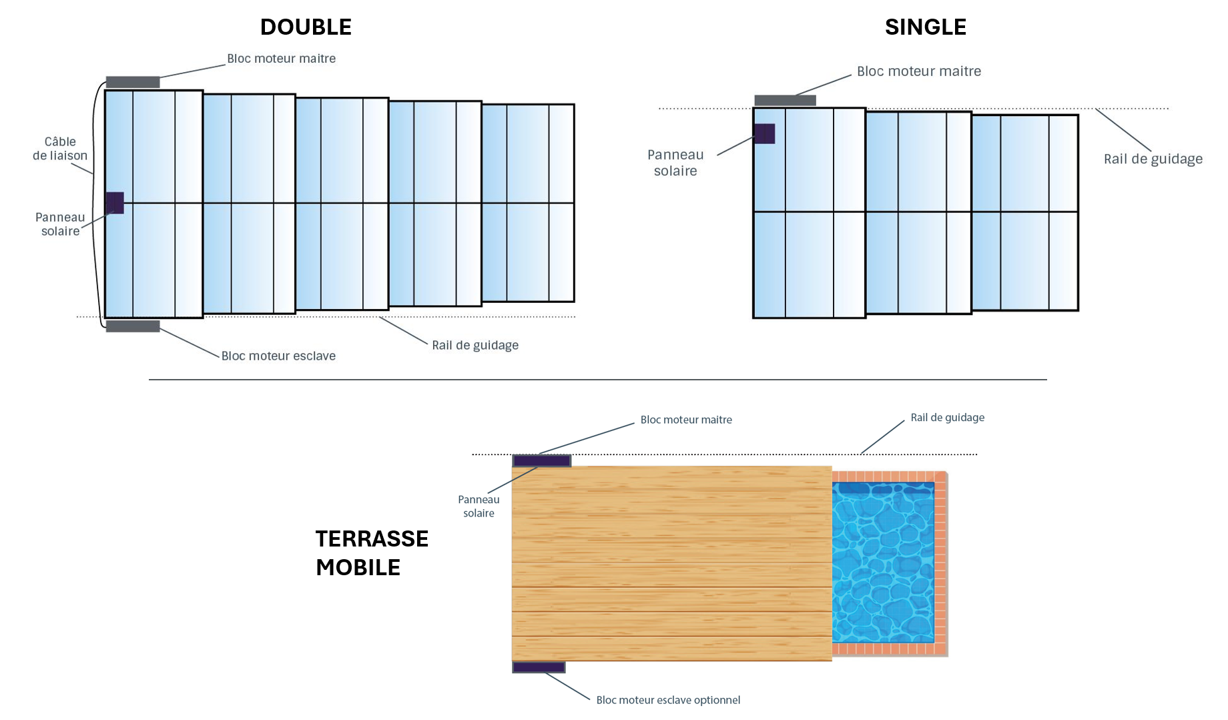 Fonctionnant en alimentation solaire autonome avec batteries intégrées, ce moteur d’abri de piscine ne nécessite aucun raccordement secteur. Disponible en configuration SINGLE (moteur d’un seul côté) ou DOUBLE (moteur de chaque côté) selon la dimension de l’abri, elle se pilote par télécommande longue portée, offre un fonctionnement silencieux et dispose d’un débrayage manuel pour déplacer l’abri à la main en cas de besoin.