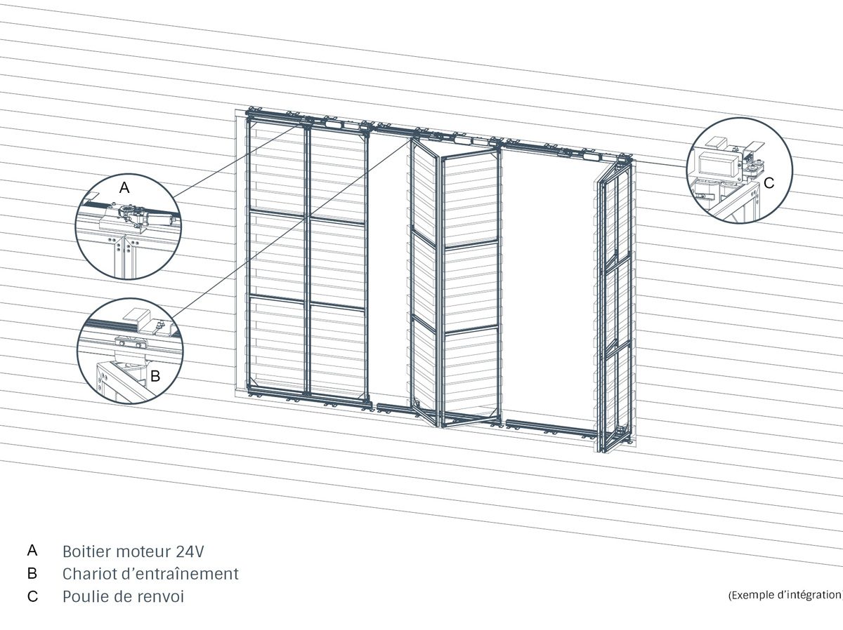 Cette solution a été conçue pour offrir une intégration la plus discrète et constitue la solution de motorisation la plus économique du marché pour le volet pliant coulissant.