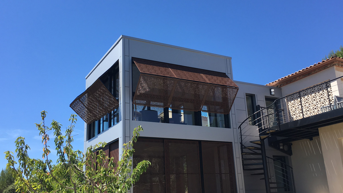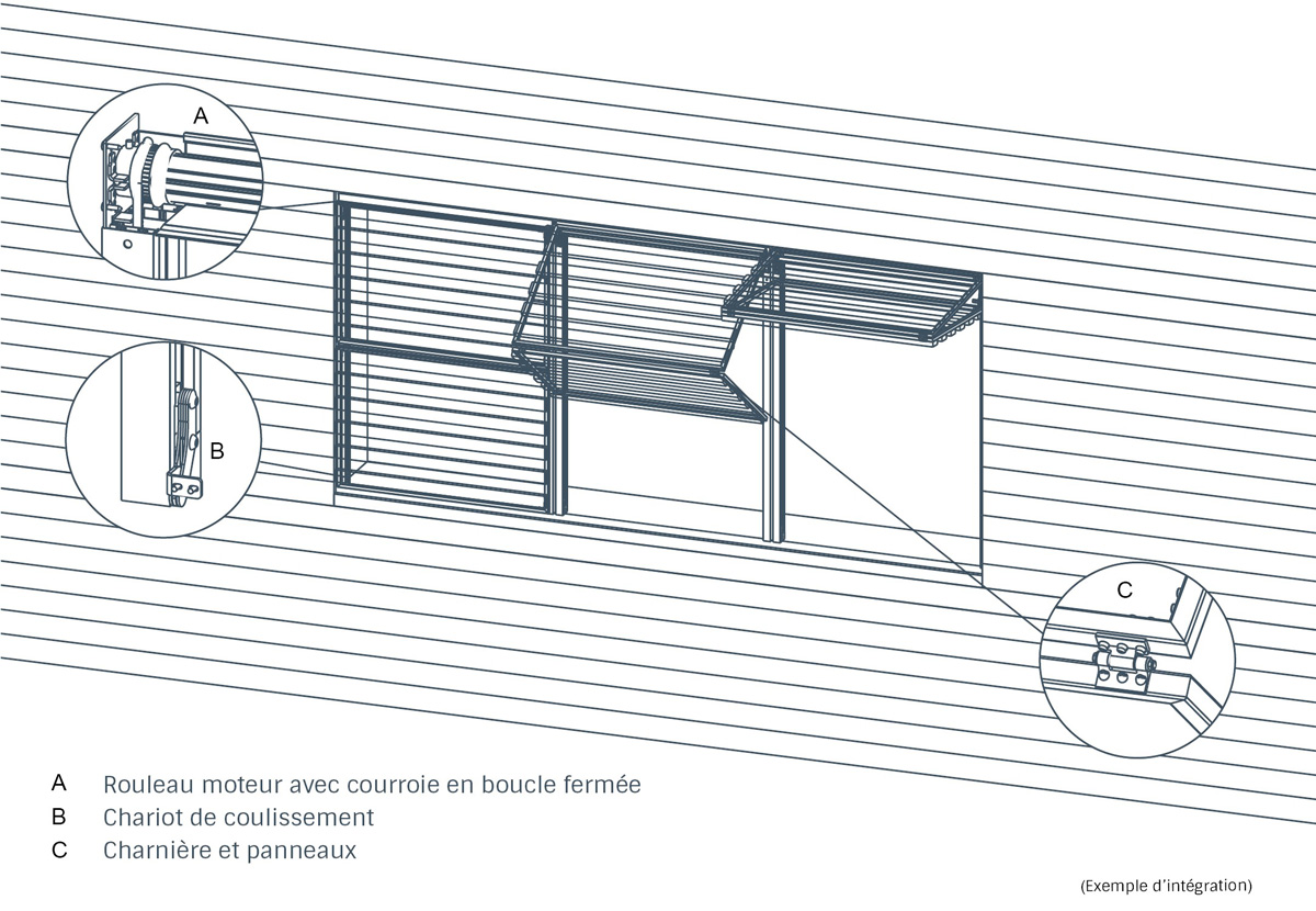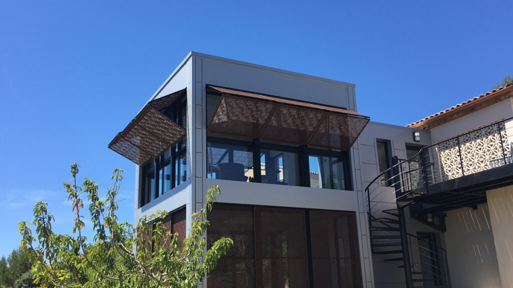 Le brise-soleil relevable NOVAL est un volet motorisé composé d’un cadre et de deux panneaux se repliant sous la forme d’une casquette au-dessus de chaque fenêtre afin de contrôler les apports solaires et ainsi favoriser le confort intérieur. En été, il participe à la régulation thermique des locaux et s’inscrit donc dans le respect des recommandations RT2012.