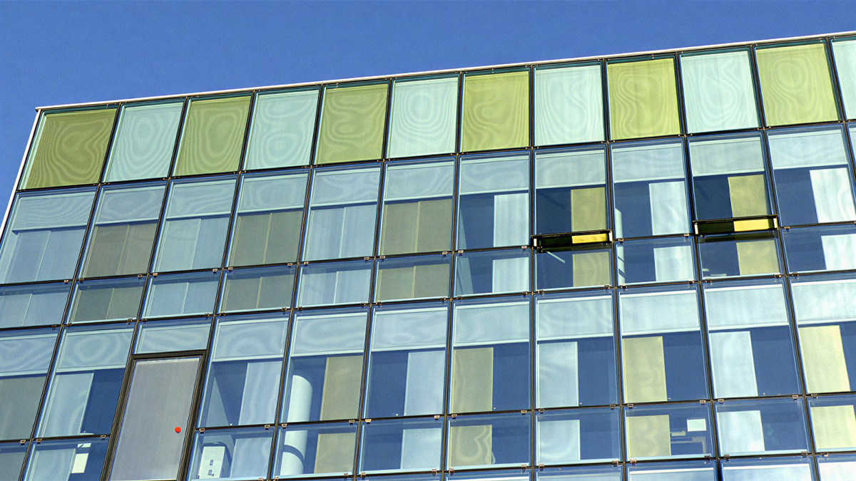 Pour ce bâtiment de bureaux, 780 rideaux brise soleil en mailles d’aluminium tissées « argent » ou « or » sont intégrées dans la façade.