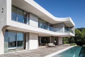 Motorisation de coulissants minimalistes à galandage pour la villa Kétamine, dans le sud de la France.